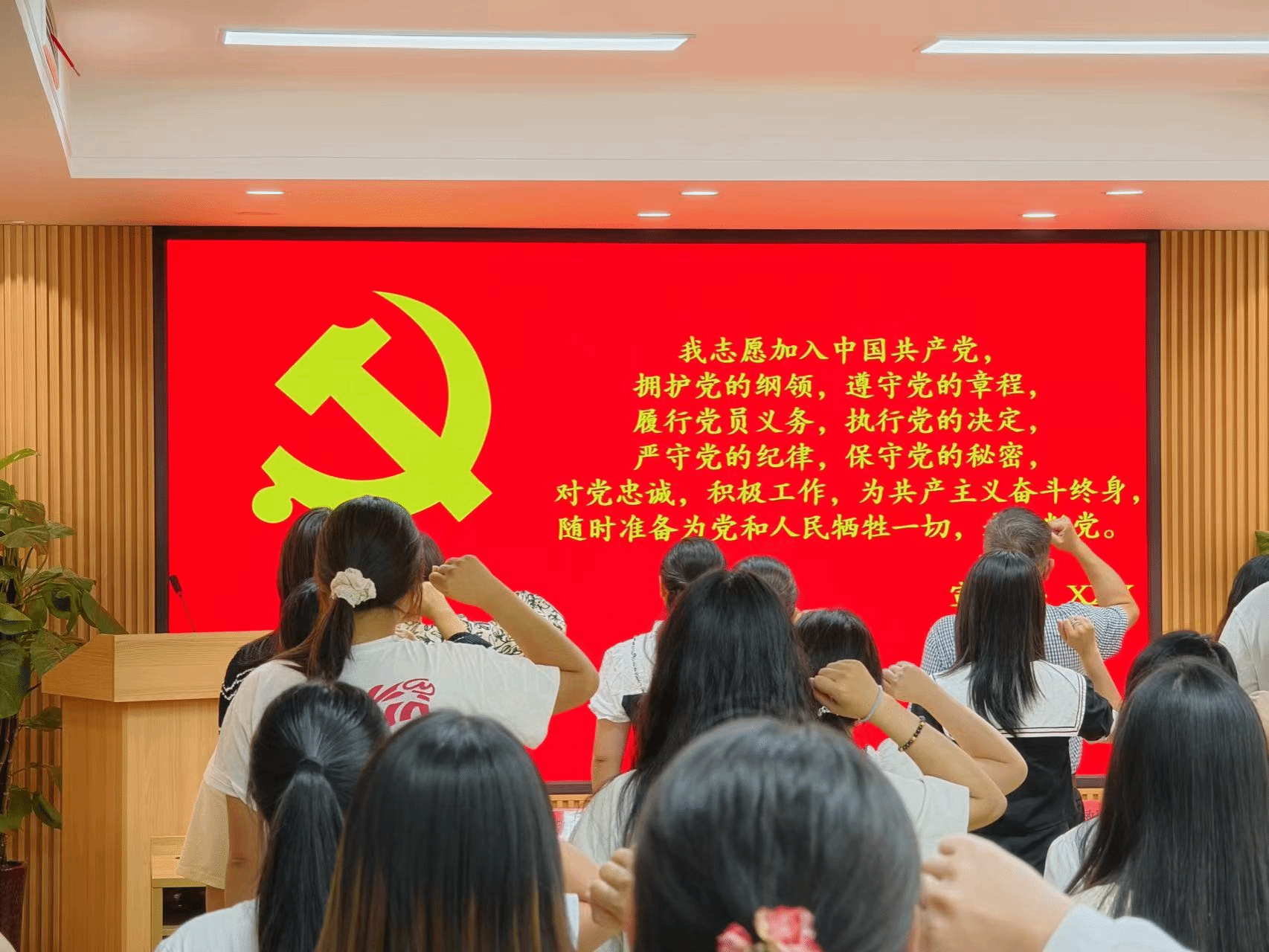 在本科生第一党支部书记陈卓聪同志的带领下,预备党员们举起右手,紧握拳头,面对党旗庄严宣誓,以铮铮誓言,传达对党的绝对忠诚和为共产主义理想不懈奋斗的决心。