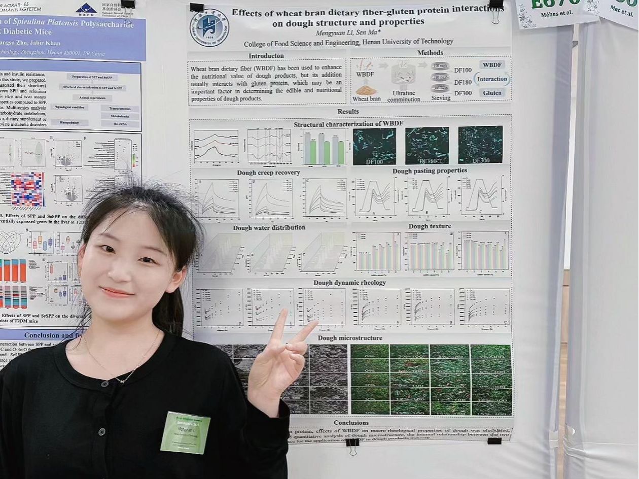 当我在撰写第一篇论文时,经历了多次拒稿,但在老师的不断鼓励下,我重拾信心,并对论文内容进行重大修改。从“拒稿”到“大修”,再到最终的“录用”,第一篇论文的发表之路布满荆棘。每一次审稿意见都像一次严峻的考验,但当最终收到接收邮件时,经历的所有挫败感和无数个挑灯夜战的辛劳,都瞬间化为了成功的喜悦与巨大的释然。首次论文接收的经历给予了我极大的鼓舞,并激励着我不断向前,随后发表多篇高水平论文。我不仅学术成绩优异,还积极参与国内外学术会议,不断拓宽学习视野,提高研究能力。我先后参加了“匈牙利第六届生物系统和食品工程国际会议”、“第三届ICC亚太区粮食科技大会”、“第三届粮油食品科学与技术发展国际会议”、“中国粮油学会第四届粮油营养学术交流大会”、“中国粮油学会第八届小麦加工与主食产业大会”等多个具有影响力的学术会议,拓宽学习视野,激发创新思维,提高研究能力,为未来的学术道路奠定了更加坚实的基础。
